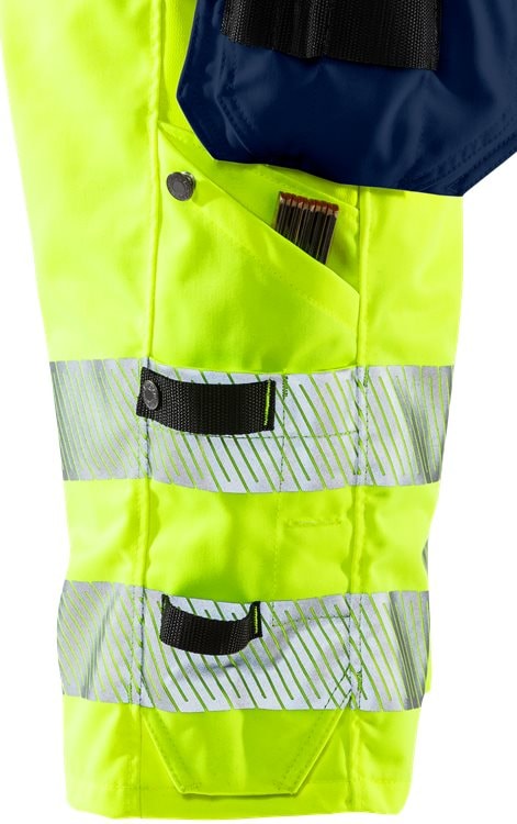 - Partier med 4-vägs stretch i midja, sidor, ok bak och gren/ 2 CORDURA®-förstärkta löst hängande spikfickor, den ena med 3 mindre fickor och verktygshälla och den andra med en extra ficka/ 2 sidfickor/ D-ring/ 2 bakfickor med dragkedja/ Dubbel förstärkt grensöm/ Hammarhank/ Tumstocksficka med verktygsficka, pennficka samt knapp och hälla för kniv/ Benficka med telefonficka, ID-kortsficka och ficka med dragkedja/ Godkänd enligt EN ISO 20471 klass 1