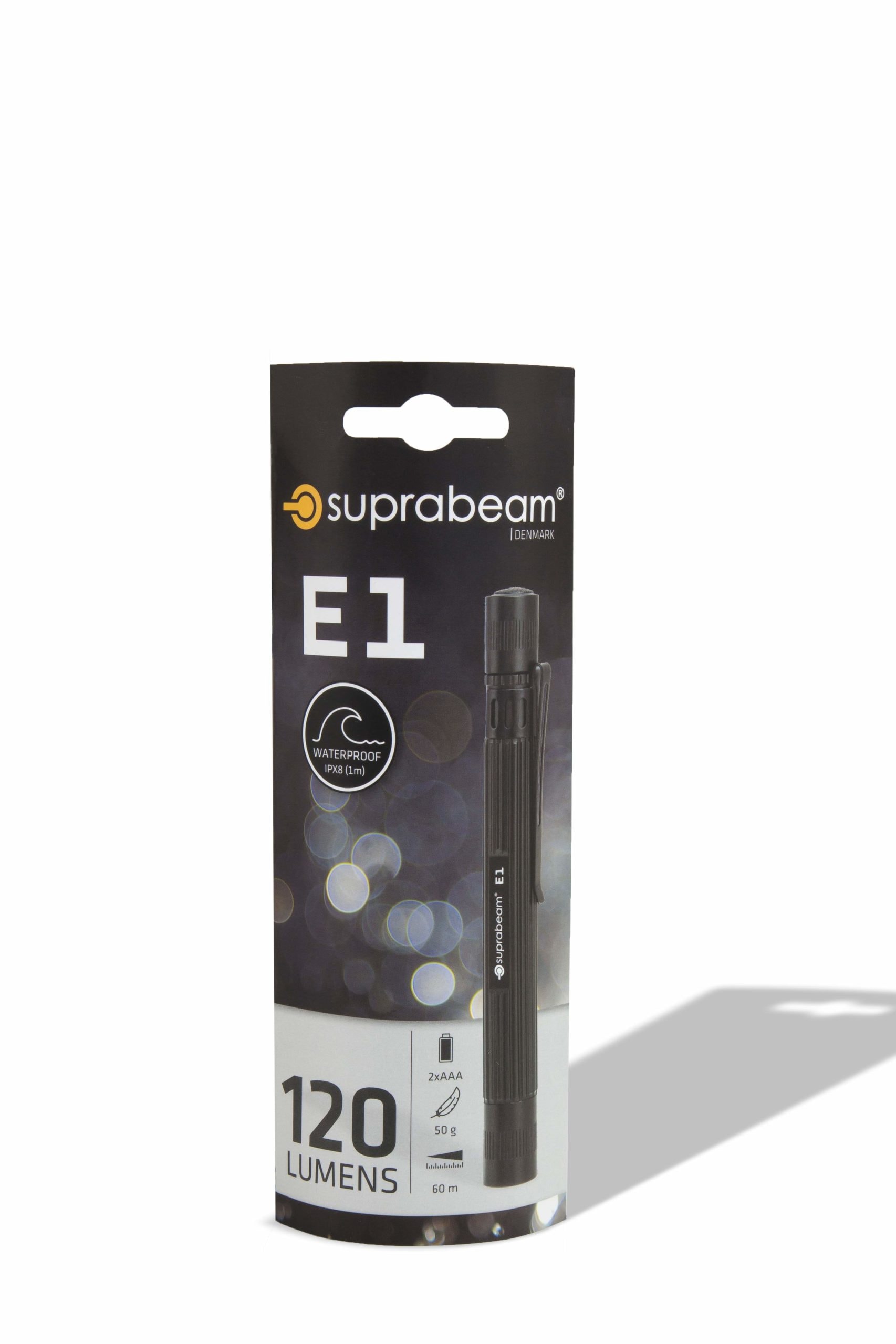 E står för ”essential” eller “grundläggande” vilket präglar seriens egenskaper. Modell E1 penn-ficklampa har endast de nödvändigaste funktionerna och har en robust design med en mekanisk på/av-knapp. En enda LED-krets i modell E1 ger 120 lumen i en perfekt fokuserad ljuskägla. Om du är ute efter en enkel men pålitlig ficklampa i pennformat, är E1 vad du söker. E1-modellen använder 2st AAA-batterier och har en drifttid på hela 3 timmar, men väger endast 50 gram.| LED | 1 CREE Power Chip |