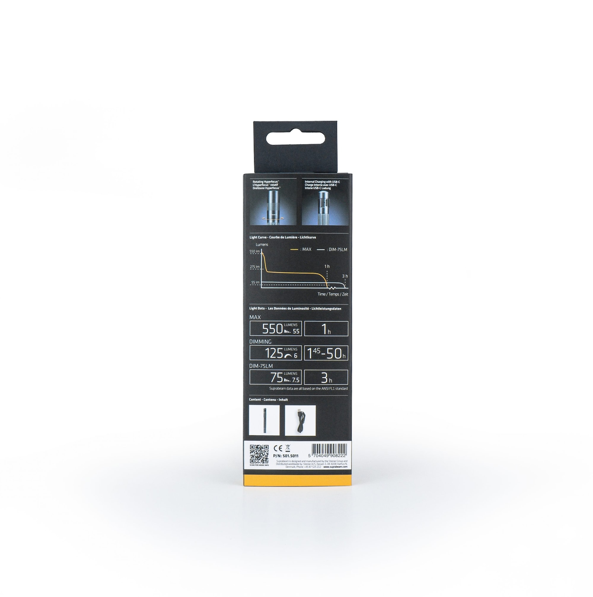 Suprabeams Q1r är utrustad med ett Li-Po batteri, intern USB-C laddning, elektronisk strömbrytare och ett kraftfullt LED-chip. Denna kombination levererar häpnadsväckande 550 lumen – med bibehållen storlek av en klassisk penna.