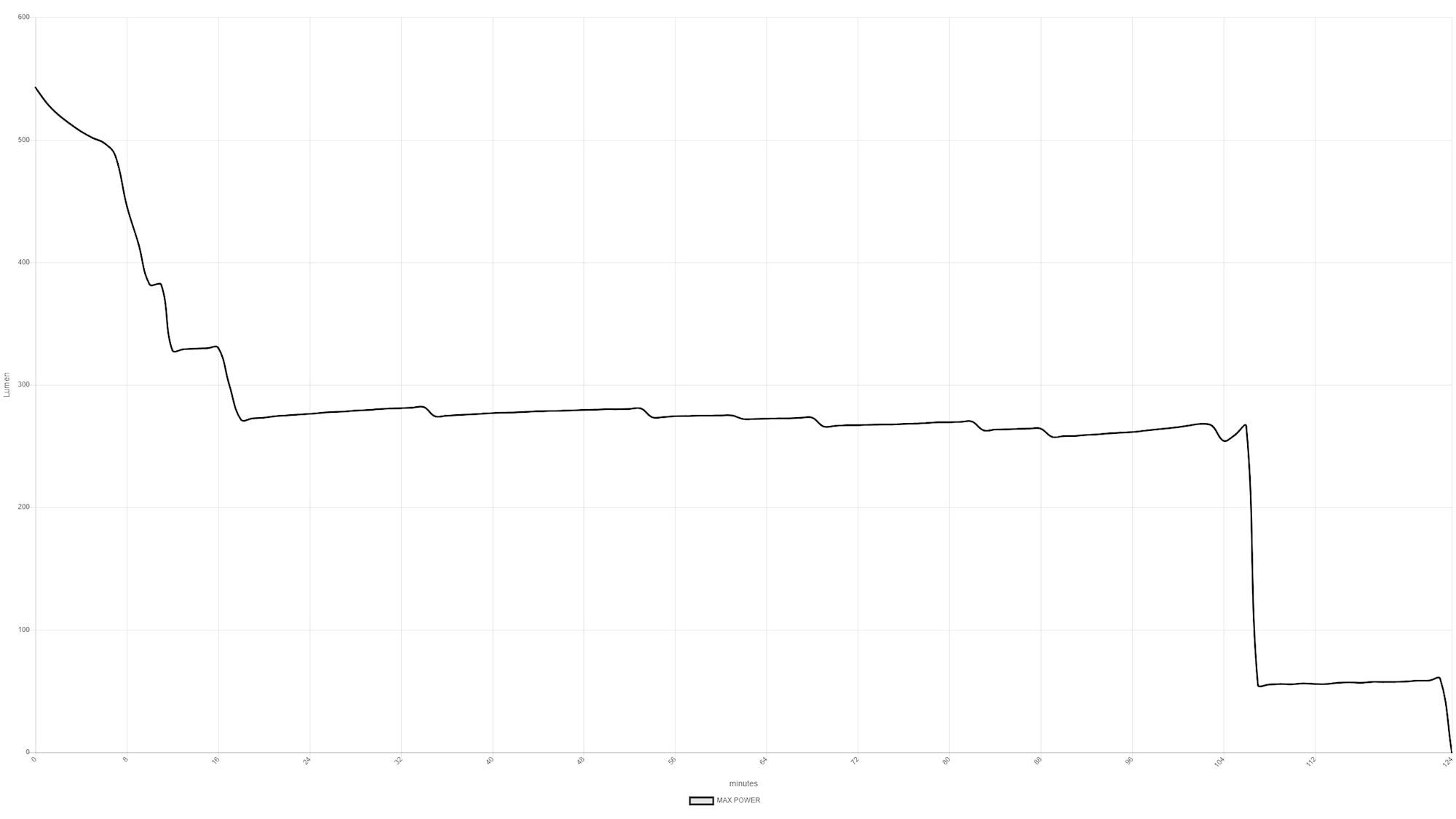 | Ljusflöde | Max: 500 Lumen Medium: 250 Lumen Low: 75 Lumen |
