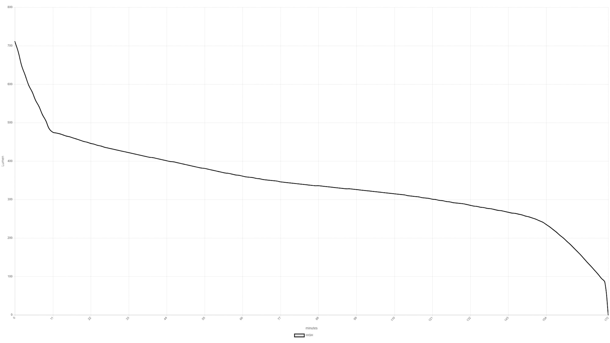 | Belysningstid | High: 2 timmar 50 minuter Medium: 4 timmar 15 minuter Low: 12 timmar Spotlight: 4 timmar |