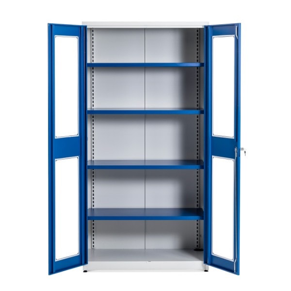 Högt verktygsskåp med plexiglasdörrar och kodlås. BxDxH 1020x540x2000 mm. Robust konstruktion med 3-punktslåsning. Försett med perforerade skenor för montering av olika tillbehör som verktygspaneler, fasta och utdragbara hyllplan, lådor och lådfack. Skåpet levereras med 2 plexiglasdörrar HxB 795x 307 mm. Plexiglasets mått: 770x282 mm. Stomme RAL 9002, dörrar 5002. Tillbehör och hyllor köps separat.