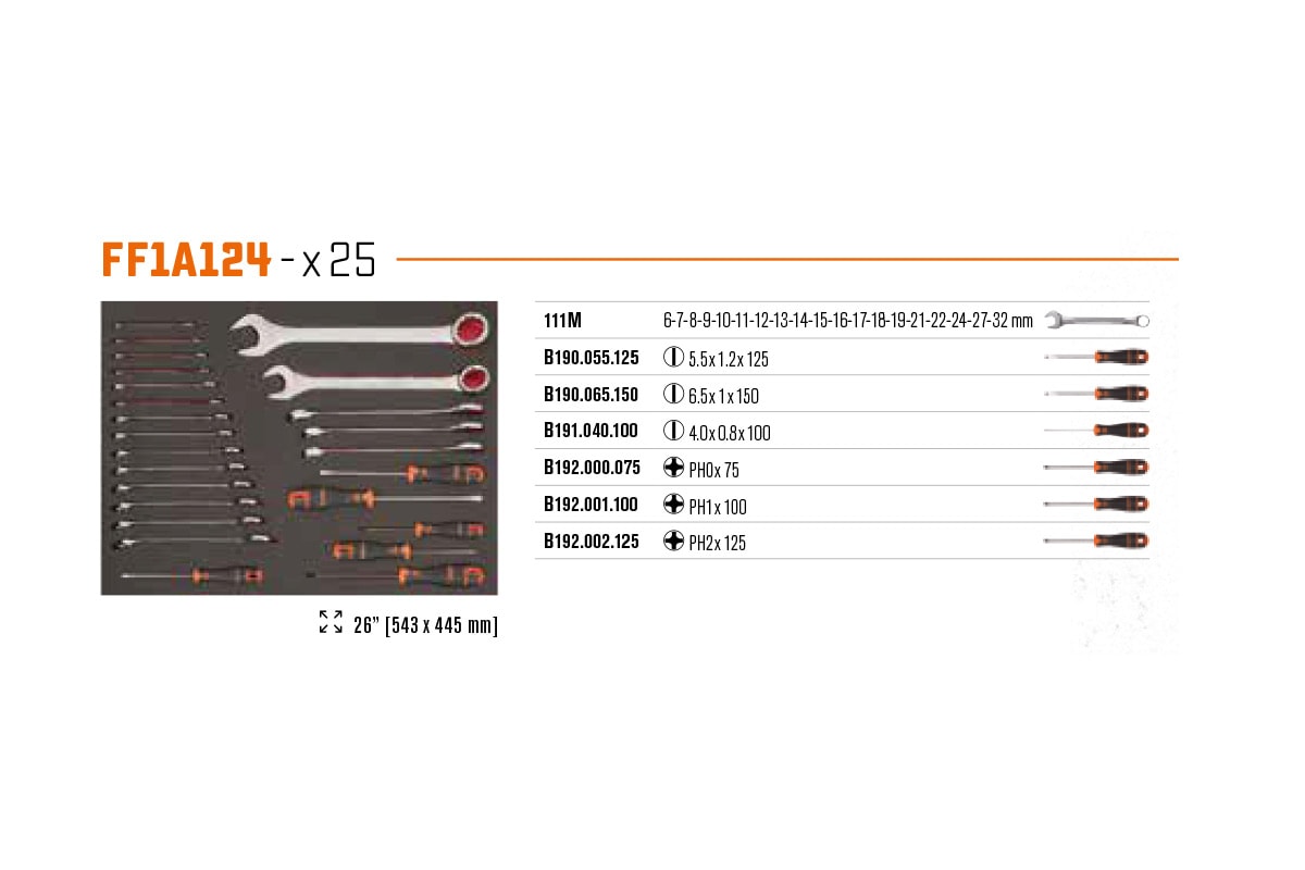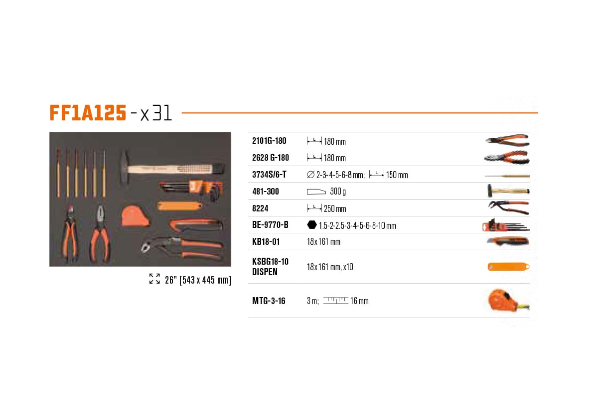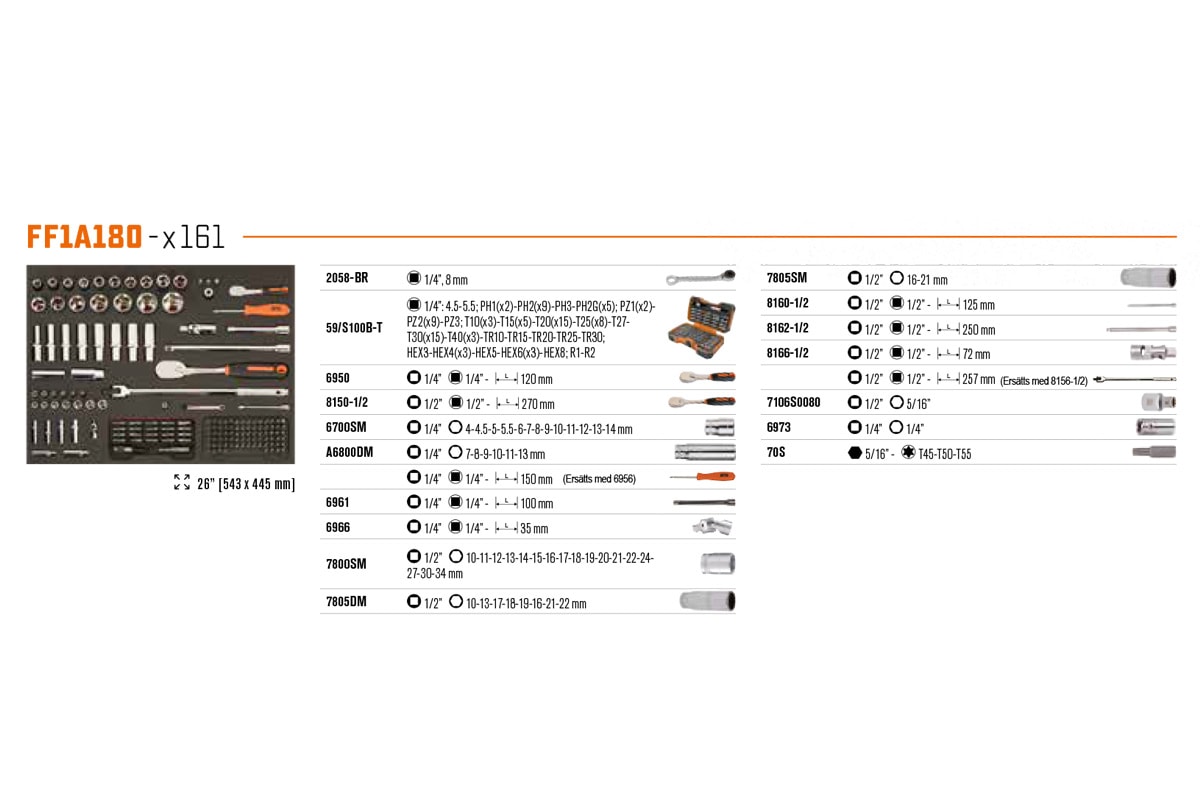 Verktygen ligger i formskurna skuminlägg där varje verktyg har sin plats för att användaren på ett enkelt och överskådligt sätt skall kunna hitta verktyg och även se om något verktyg saknas.
