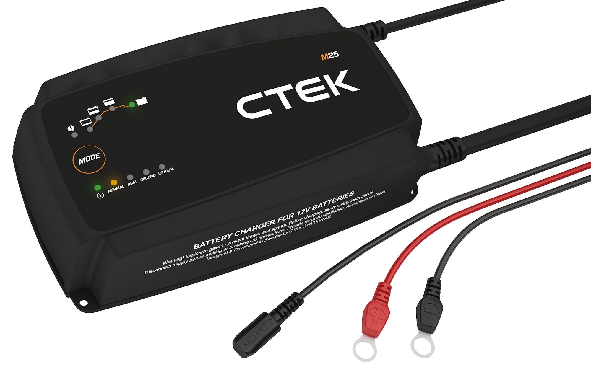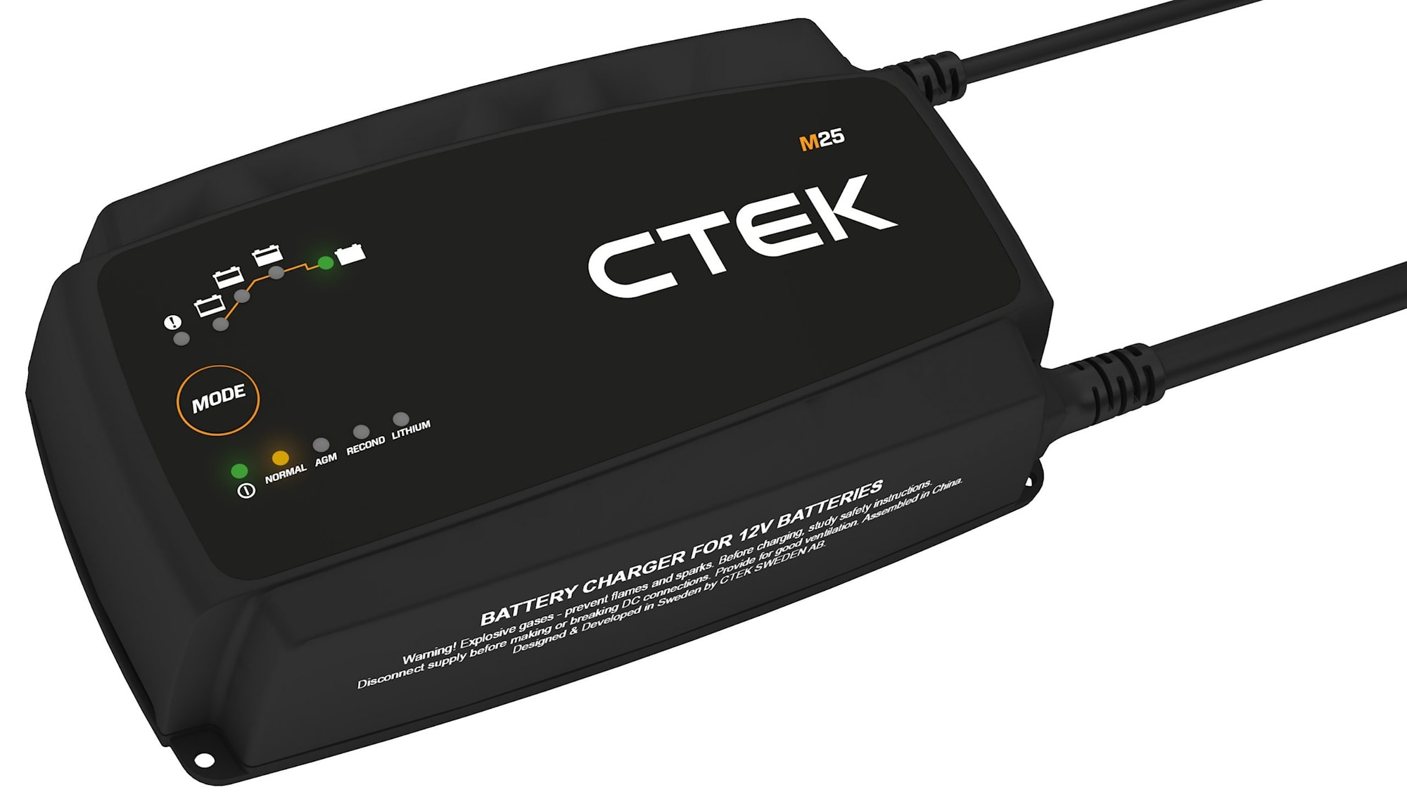 M25 är den perfekta lösningen för laddning av större batteribankar Laddaren har en fyra meter lång sekundärkabel med M10 ringkabelskor och temperaturgivare för optimerad laddning oberoende av temperaturen, vilket ger extra flexibilitet i fasta installationer. M25 är en helautomatisk åttastegsladdare.
