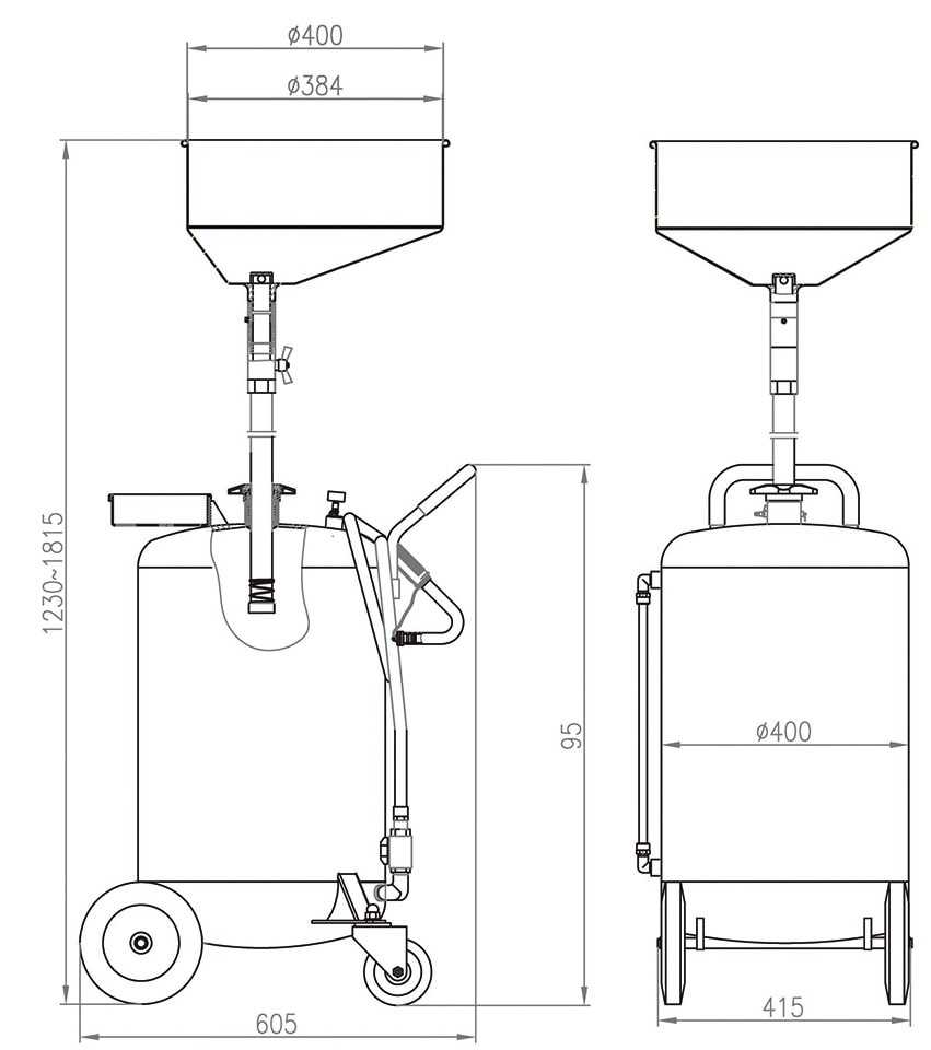 - Spilloljeuppsamlare för dränering av spillolja från motorer, växellådor etc genom sjävtryck