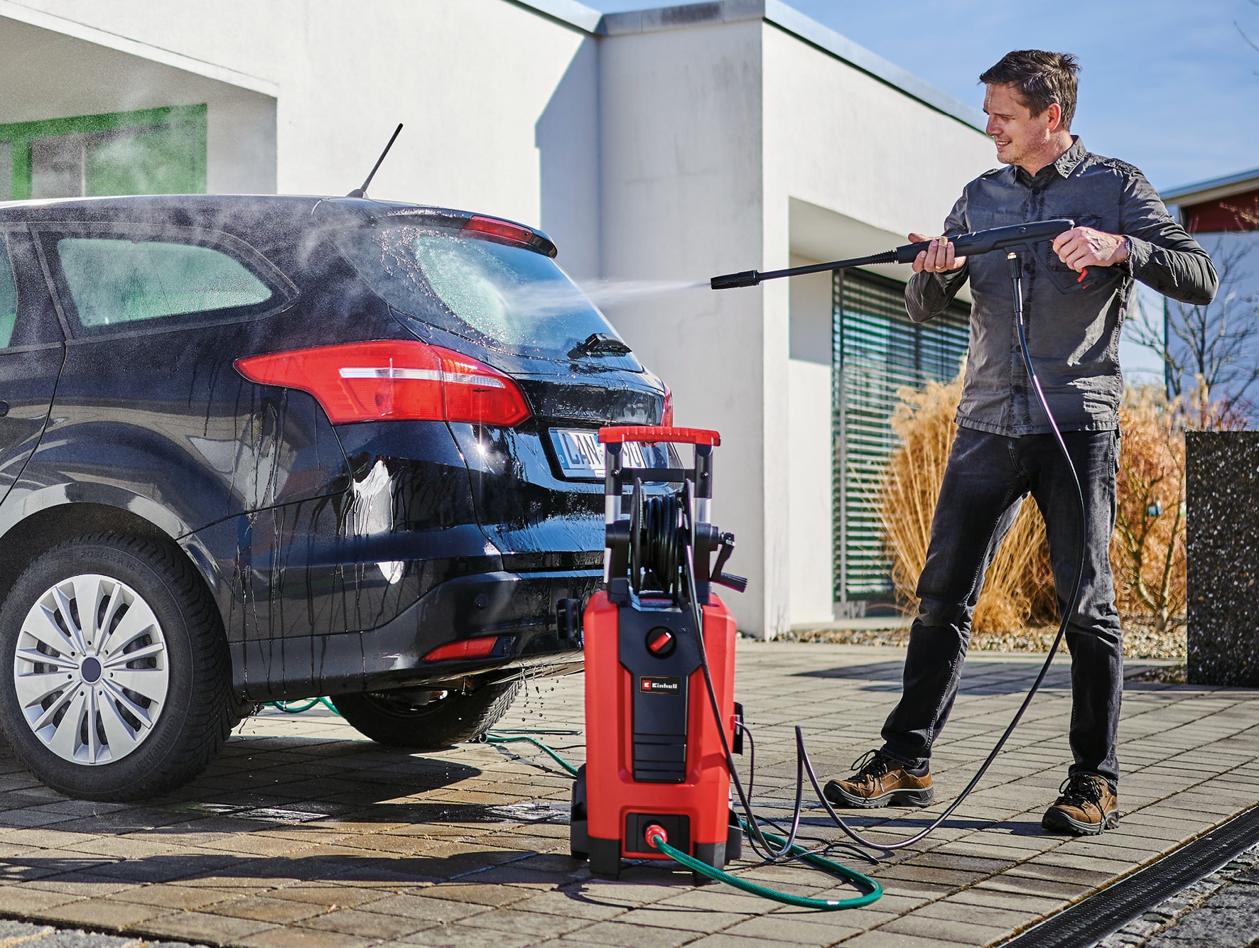 Modulärt snabbkopplingssystem Med fast monterad slangupprullare för förvaring av slangen Inkl. pistol, slang, lans, roterande munstycke, punkt- och bredstrålemunstycke, borste, rengöringsmedelsbehållare och terrassrengörare