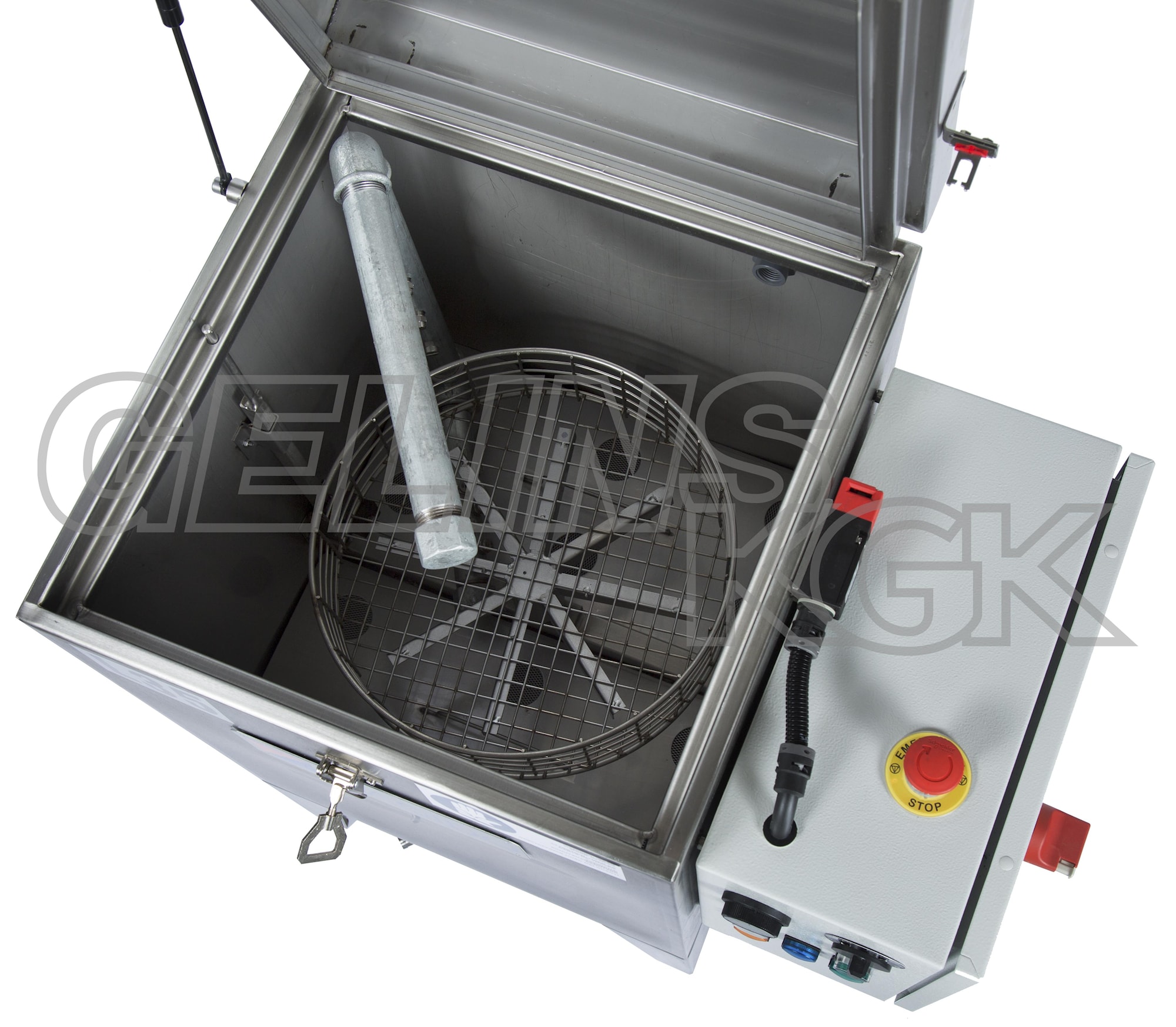 Automatisk smådelstvätt i rostfritt stål med värme. Spolröret med dysor är fast. Godskorgen roterar.