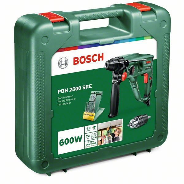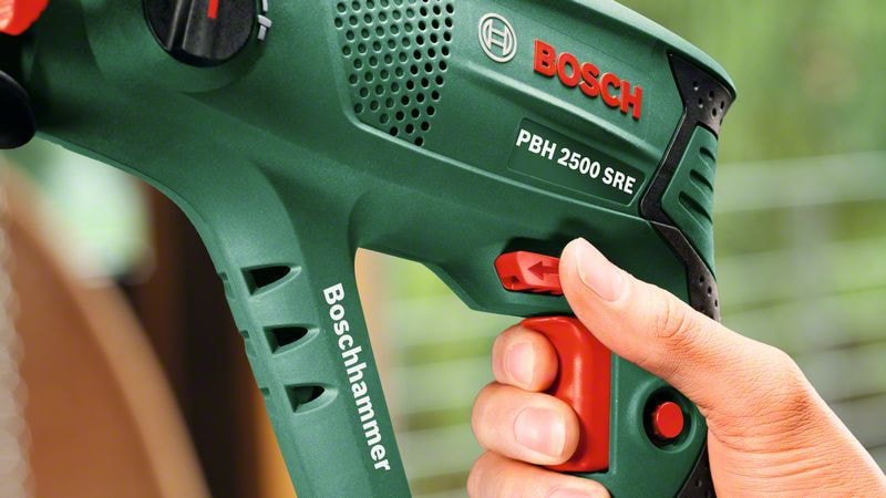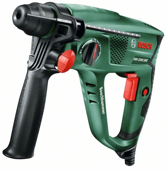 PBH 2500 SRE borrhammare med kabel är perfekt för tung borrning, hammarborrning och bilning i betong, murverk, kakel, trä och metall. En slagkraft på 1,9 joule levereras av den pneumatiska Bosch-hammarmekanismen, som drivs av en 600 W-motor. Chucken med SDS plus ger verktygslöst byte av tillbehör och medföljande borrchuck används för borrbits med runda skaft. En optimal arbetsvinkel säkerställs av Vario Lock bilningsfunktion som ger 36 valbara mejselpositioner. Bosch Electronic Speed Control levererar korrekt hastighet för materialet genom den tryckkänsliga avtryckaren.