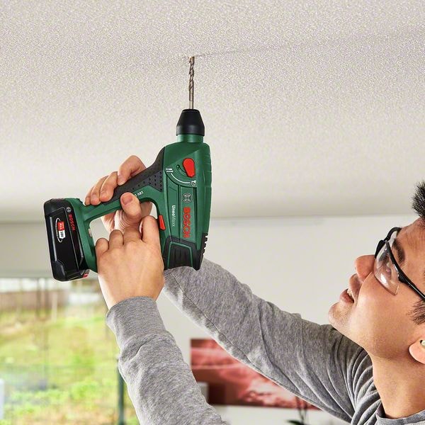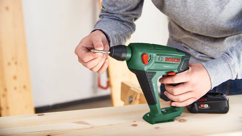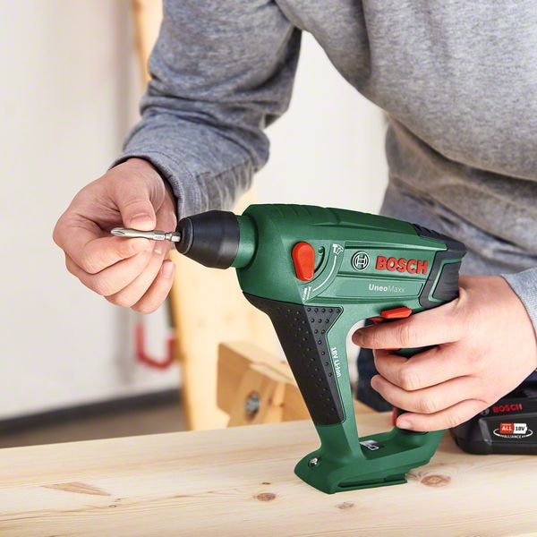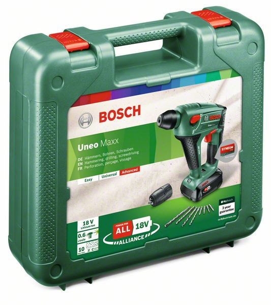 3-i-1-verktyget Uneo Maxx sladdlös borrhammare är kraftfull och kompakt och utformad för tuff hammarborrning, borrning och skruvdragning i betong, murverk, metall, trä och kakel. Den pneumatiska Bosch-hammarmekanismen och en stark motor möjliggör enkel och snabb borrning i betong på upp till 10 mm. Den har en systemchuck med SDS för intuitiv användning och snabba byten av alla 1/4"- och SDS quick-bits på 3 sekunder. Detta lätta och kompakta kraftpaket på 1,4 kg arbetar bekvämt i trånga utrymmen och kan tackla alla projekt, från borrning i betong till precisionsskruvdragning i trä, med enkelhet. Verktyget ingår i POWER FOR ALL ALLIANCE. Ett batteri kan användas i en stor mängd verktyg från olika märken.
