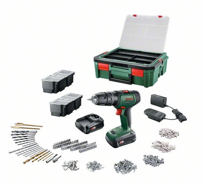 Bosch Slagborrmaskin 18V med 2x1,5Ah batterier & laddare i S-box + Tillbehörssats