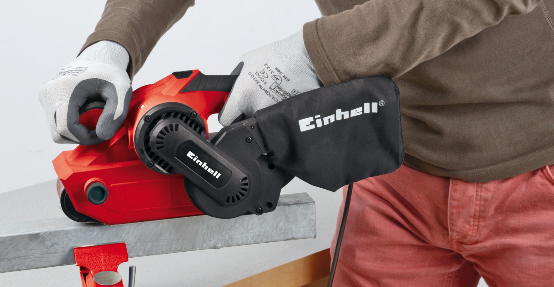 Ett extrahandtag garanterar exakt styrning av bandslipen. Verktyget levereras med ett dammutsug och en dammpåse för liten dammutveckling.