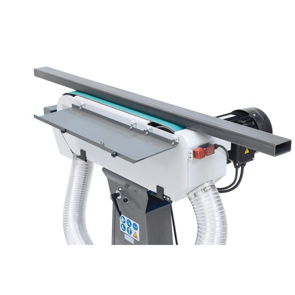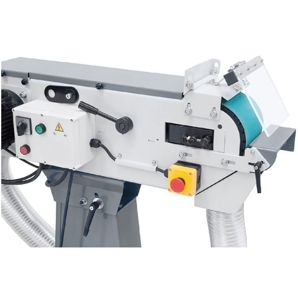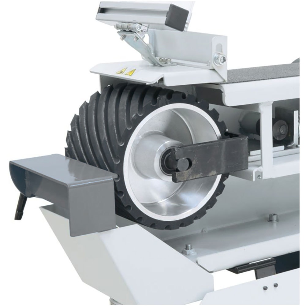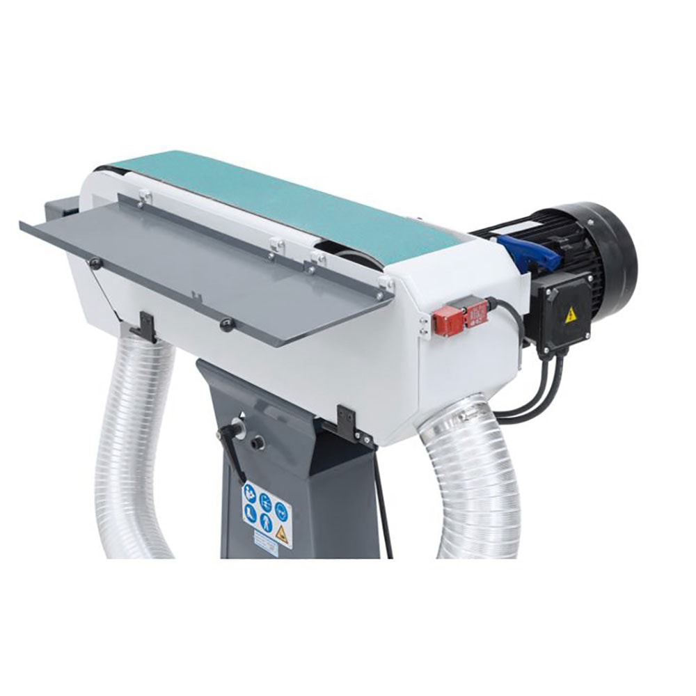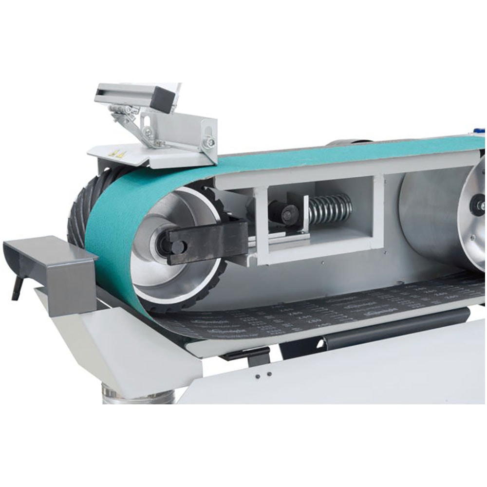 - Kan användas universellt för slipning av kanter, ytor och rundslipning. Maskinen har en stor slipyta med ett skyddshölje. Den fjäderbelastade enheten säkerställer jämnt spänd rem och rembytet är snabbt och enkelt.