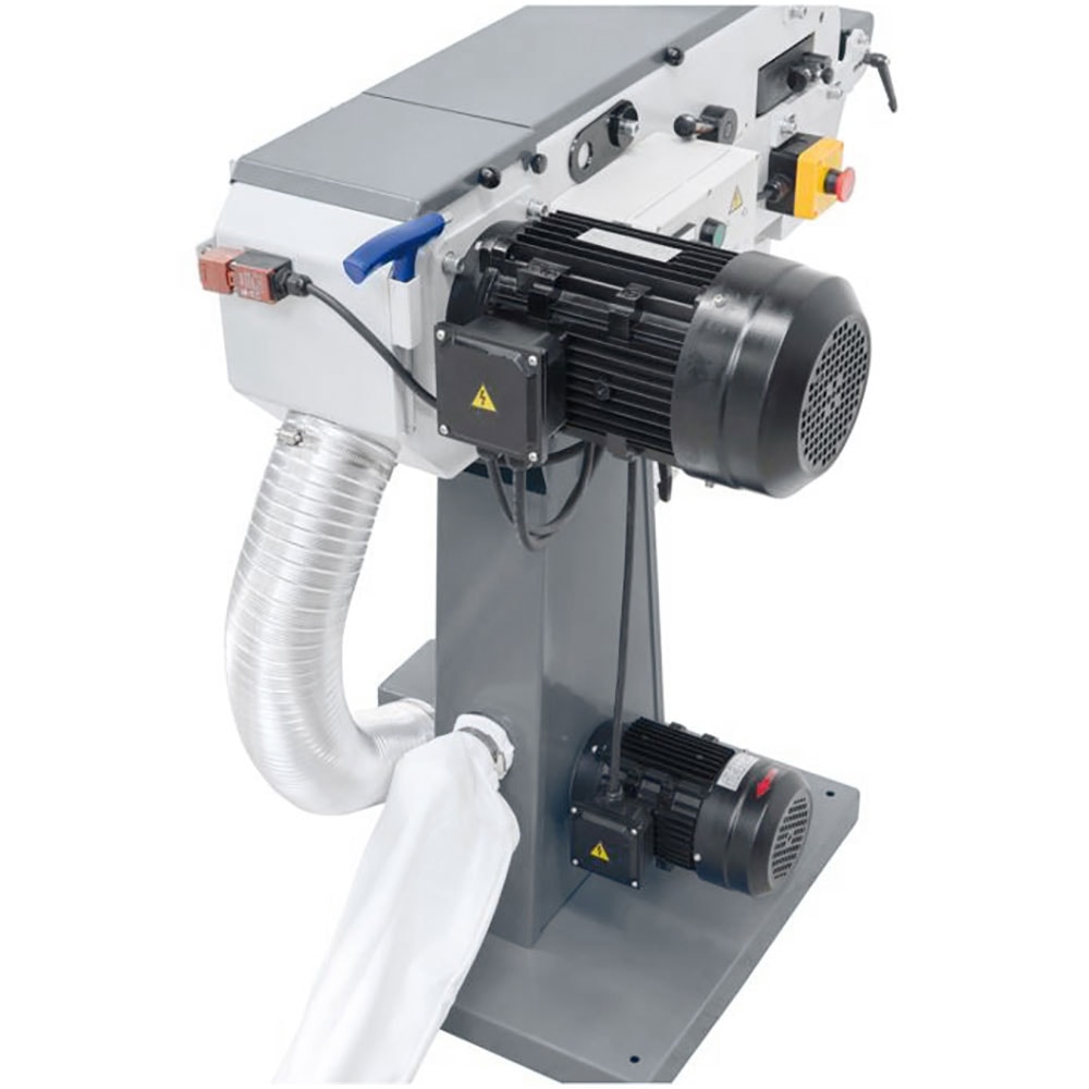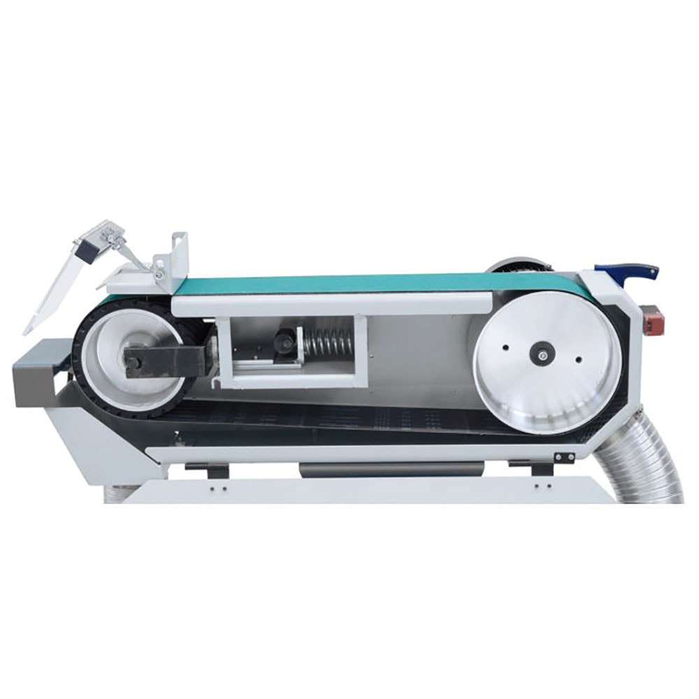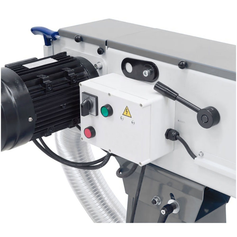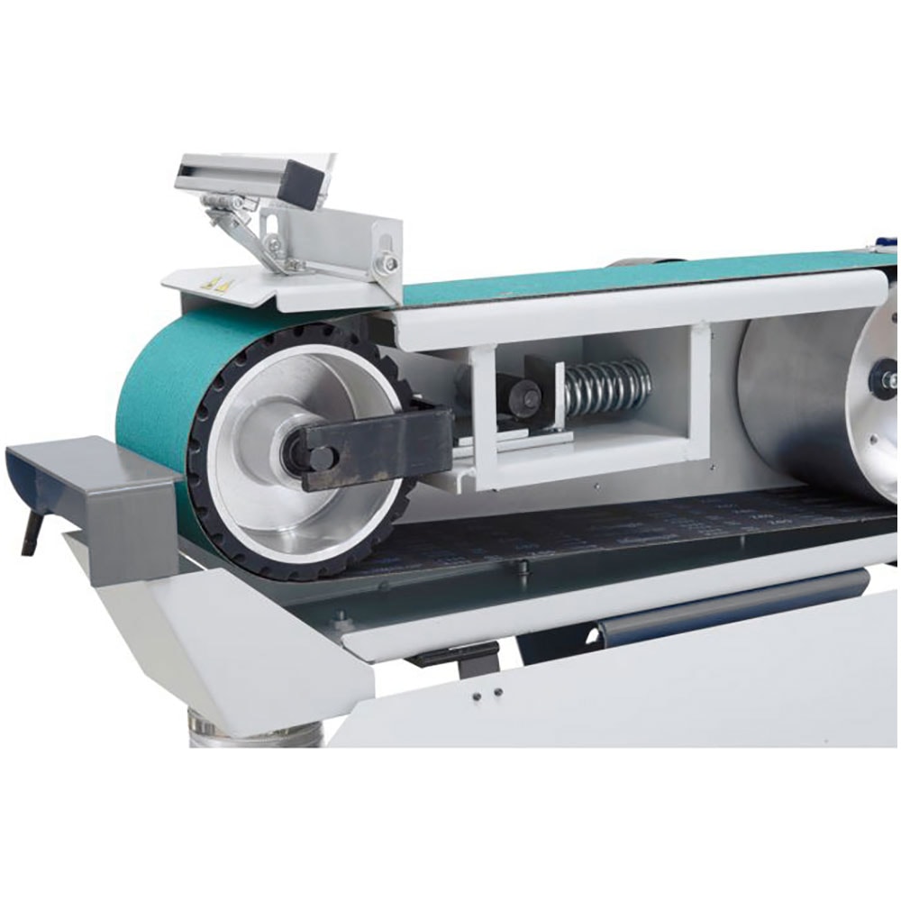 - Kan användas universellt för slipning av kanter, ytor och rundslipning. Maskinen har en stor slipyta med ett skyddshölje. Den fjäderbelastade enheten säkerställer jämnt spänd rem och rembytet är snabbt och enkelt.