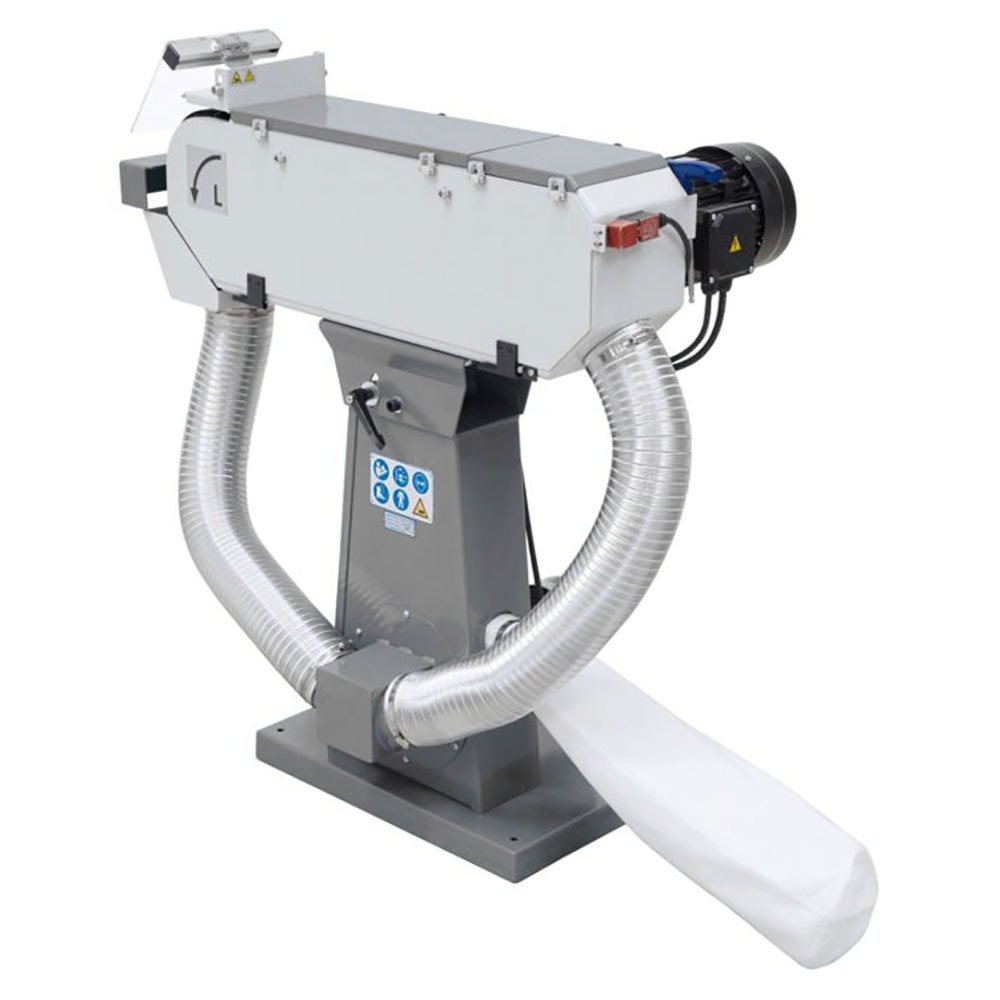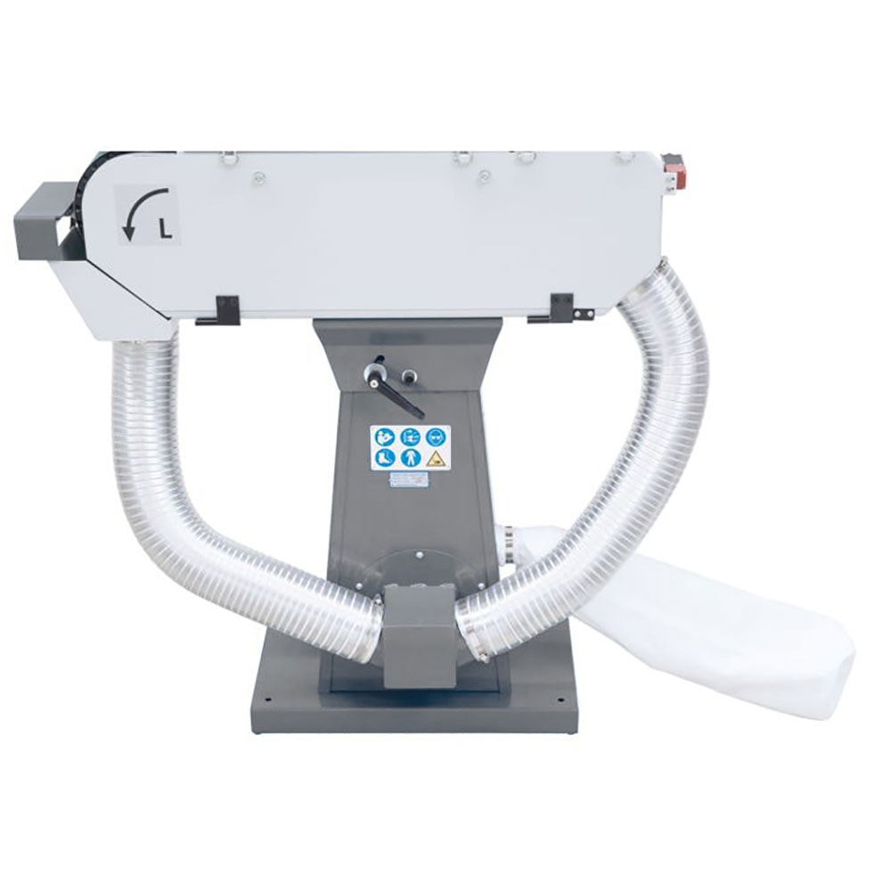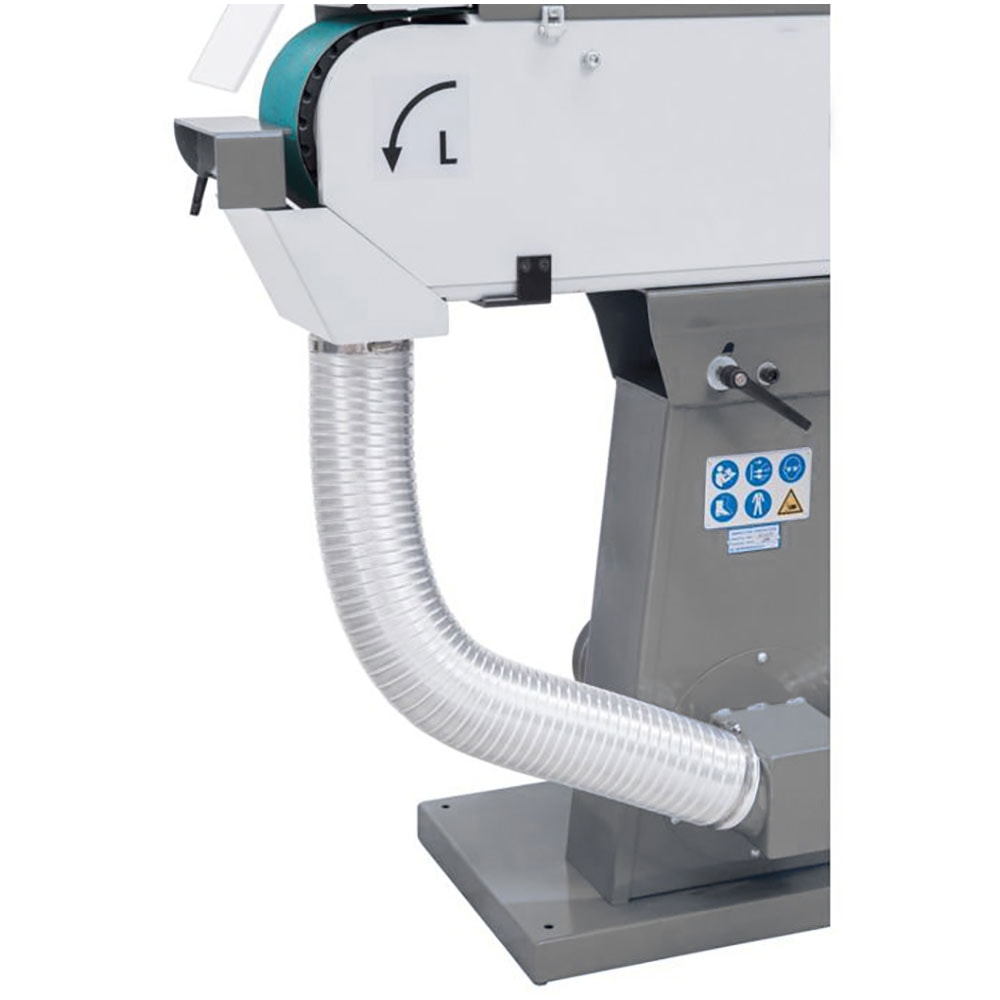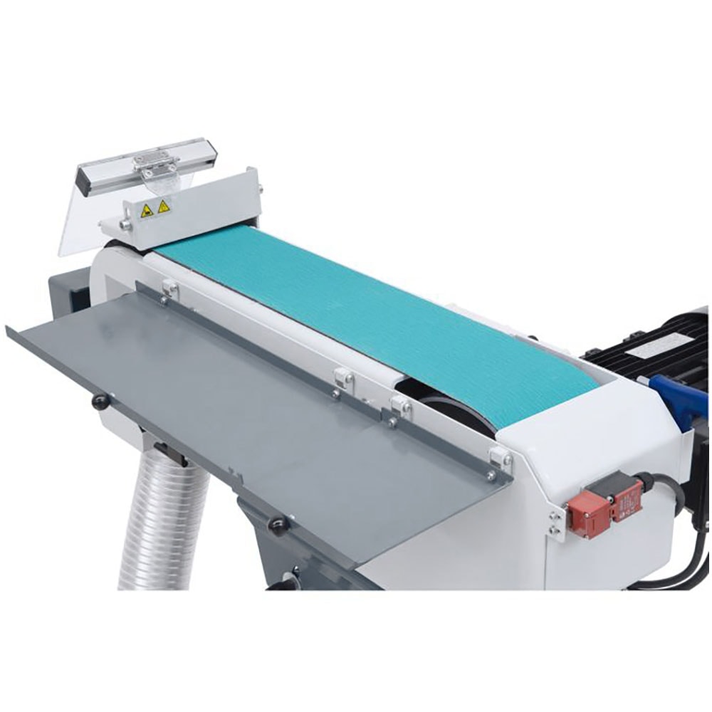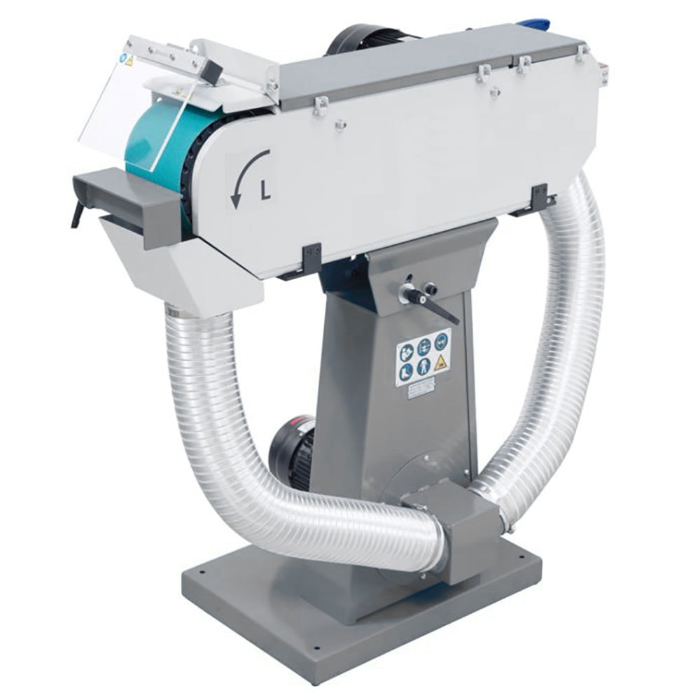 - Kan användas universellt för slipning av kanter, ytor och rundslipning. Maskinen har en stor slipyta med ett skyddshölje. Den fjäderbelastade enheten säkerställer jämnt spänd rem och rembytet är snabbt och enkelt.