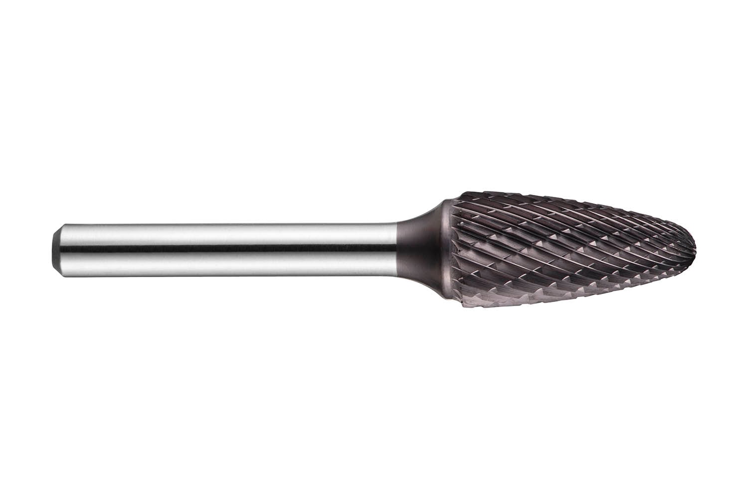Hårdmetalltopp med härdat stålskaft och TiAlN-beläggning. DC-tandning, dubbelskuren spiral med litet spånutrymme för bearbetning i flera vinklar, avrundning av kanter och slipning i svåråtkomliga områden i stål, rostfritt stål, gjutjärn, koppar eller kopparlegeringar, superlegeringar, härdade material.