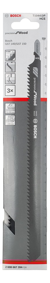 För användning med sticksågar med T-skaftsystem för fasthållning. T 1044 DP Precision for Wood sticksågblad gör exakta, snabba och raka snitt i trä. Dess ökade bladtjocklek förhindrar böjning och ger exakta snitt i korrekta vinklar. Vidare har bladets skarpslipade tänder sidotandning, vilket möjliggör snabba snitt. Bladet är tillverkat av HCS (stål med hög kolhalt), vilket är lämpligt för sågning i mjuka träslag och ej nötande trämaterial. Det har stor tanddelning (4 mm) och extraordinär längd (250 mm) för sågning i trämaterial med tjocklek upp till 160 mm.