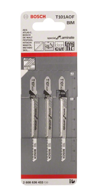 För användning med sticksågar med T-skaftsystem för fasthållning. T 101 AOF Special for Laminate sticksågblad gör rena, krökta snitt i trä. Dess precisionsslipade tänder med dubbelkonisk kropp ger rena snitt, och dess smala blad är optimerat för krökta snitt. Dess fullt härdade tandrad av HSS (snabbstål) är hopfogad med dess kropp av högelastiskt stål med hög kolhalt till en bimetall, som gör att bladet lämpar sig för att såga hårt material såsom golvlaminat. Dessutom minskas rivskadorna tack vare den spetsiga tandutformningen. Det har mycket fin tandutformning (1,4 mm) och sågar tunt trämaterial med tjockleken 1,5–15 mm.