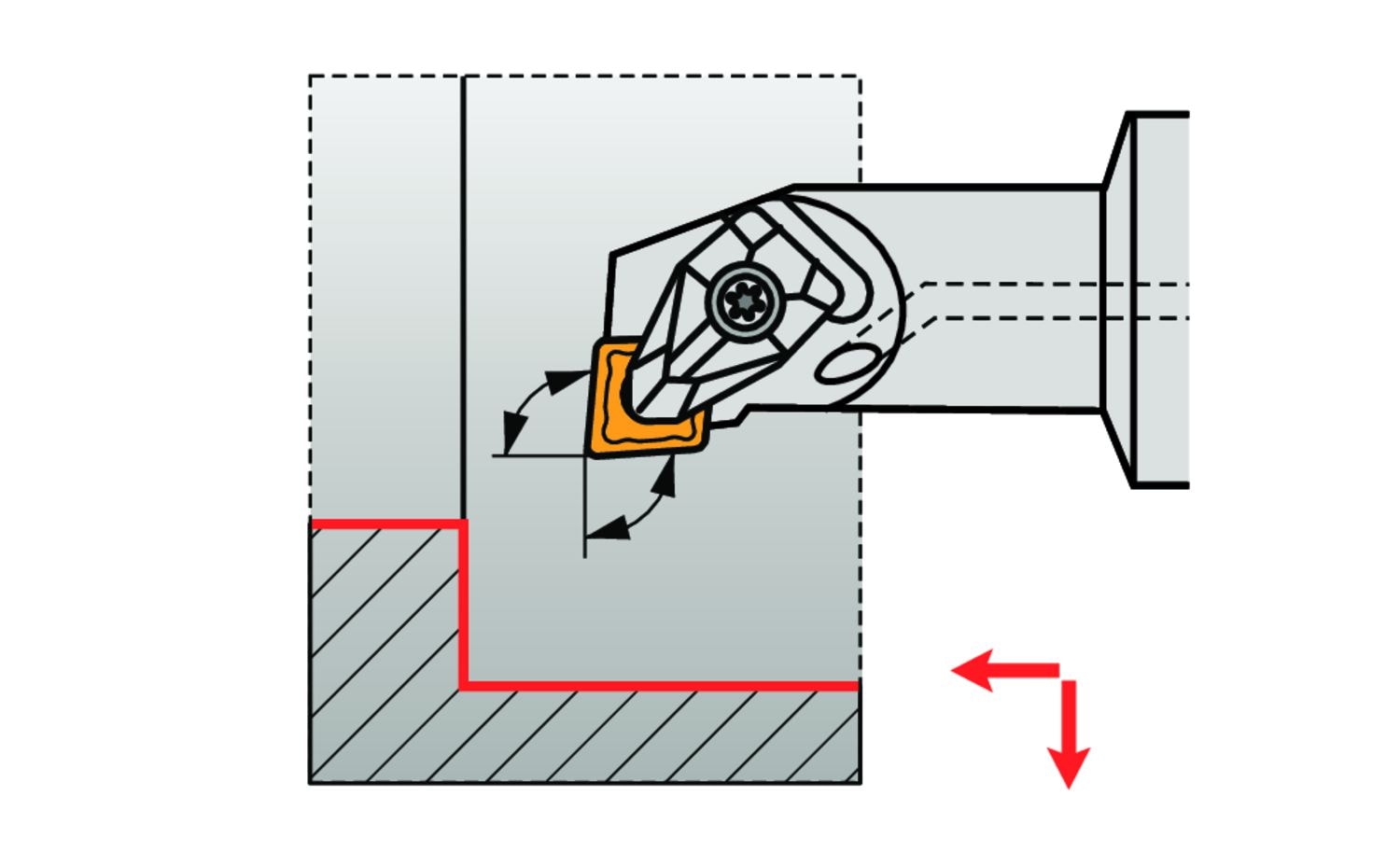 Svarvbom med dubbel inspänning för att hålla ett 80° romb negativt vändskär med en inskriven diameter 12.7mm, 4.76mm tjock (ISO-beteckning CN.. 1204.. ), höger 95° sidskär, förskjutet skaft enligt ISO 26623 (Polygon Skaftkoppling) storlek C4, with 17mm bredd och 90mm utstickslängd för invändig konsvarvning och invändig längdsvarvning med eller utan skuldra