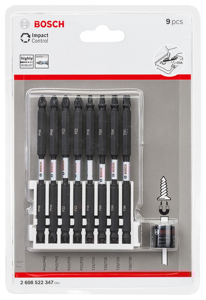 Det dubbeländade skruvdragarborret är mycket robust och perfekt för krävande arbeten och tål även hög effekt från slagskruvdragare. Borret har en utökad torsionszon som gör det extremt starkt vid långvarigt arbete. S2 Modified Steel och optimerad värmebehandling gör den extra robust för utmärkt funktion, inklusive vid fabriksinstallationer eller tungt industriellt arbete. Pick and Click Impact Control bitssatsen med 36 delar innehåller också mutterdragare samt Impact Control-universalhållare, standardmagnet och Impact Control Universal Holder Quick Release. Dessa hållare är perfekta för extra stadigt grepp om borren i universella skruvdragartillämpningar med elverktyg medan snabblåsfunktionen ger snabbt och enkelt borrbyte och stöder ytterligare den starka fasthållningen av borrarna. Borret ingår i Bosch Pick and Click-systemet, som möjliggör enskilt byggbara tillbehörsset för helt anpassningsbara borrsatser. Klickpassningsfack för enskilt inköpta paket ger en personligt anpassad sats och enkelt utbyte av gamla paket. Den har ett 1/4-tums utvändigt sexkantsskaft för användning med skruvdragare och speciellt med slagskruvdragare.