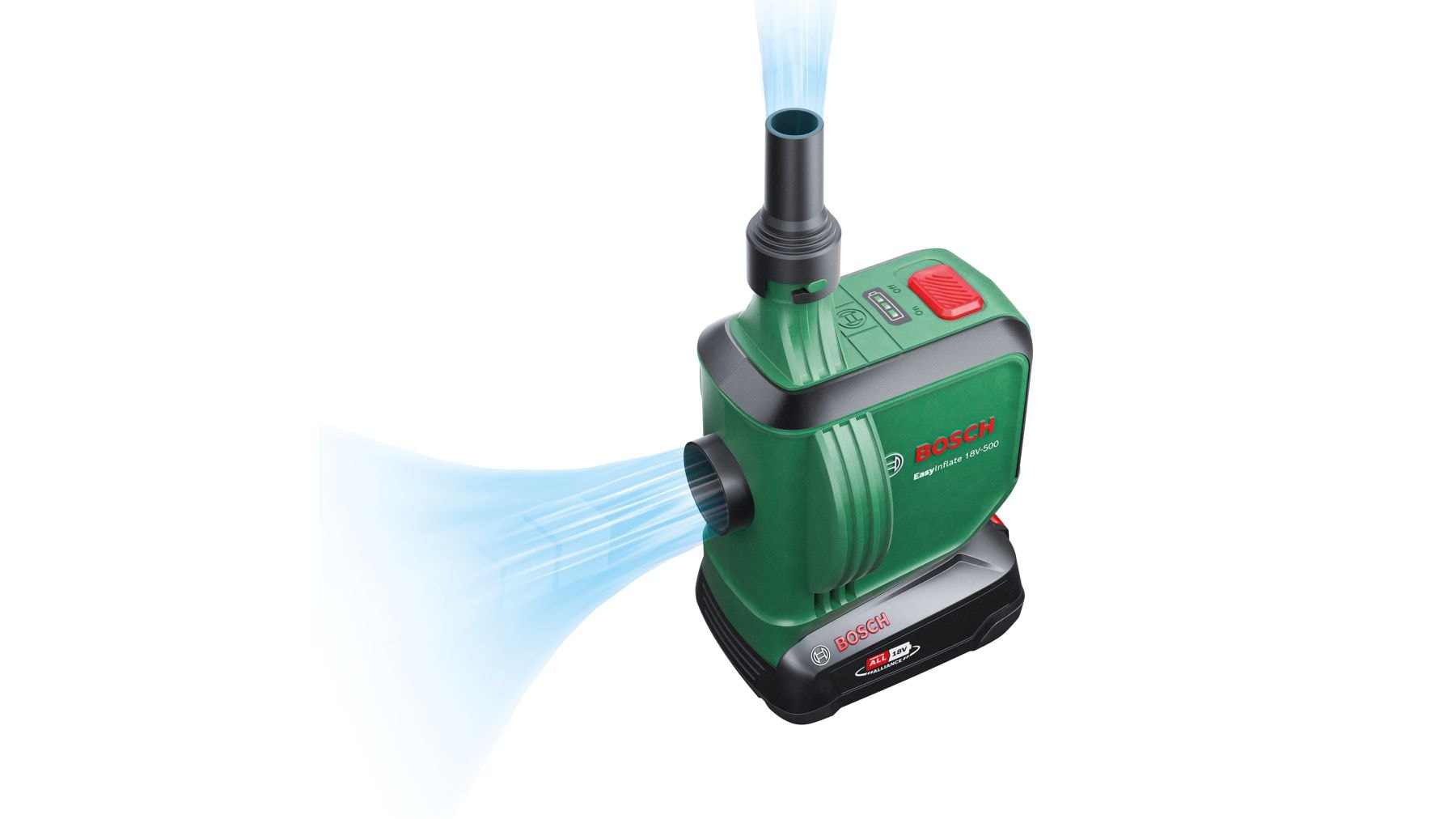 Bosch EasyInflate 18V-500 sladdlös luftpump med ett max. luftflöde på 530 l/min ger en högre hastighet och bekvämlighet vid uppblåsning och tömning av uppblåsbara badleksaker, båtar, luftmadrasser och andra stora föremål. Slangen på 50 cm och enkel på-/av-strömbrytare ger en bekväm användning. Den kompakta pumpen levereras med tre munstycken i olika storlekar och en förvaringspåse för enkel transport till poolen, sjön eller campingplatsen. Denna luftpump tillhör systemet 18V POWER FOR ALL. Ett batteri kan användas i alla 18V POWER FOR ALL-verktyg.