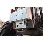 Motorsågarna sitter stadigt på minimal yta, samtidigt som de är lätt åtkomliga. Lådan är snabb att lyfta av med frontfäste; lossa en mutter, drag fästskruven åt sidan och ta bort lådan. Får plats i fronten av traktorn även med monterad frontlastare. OBS! Fästet på bilderna ingår!